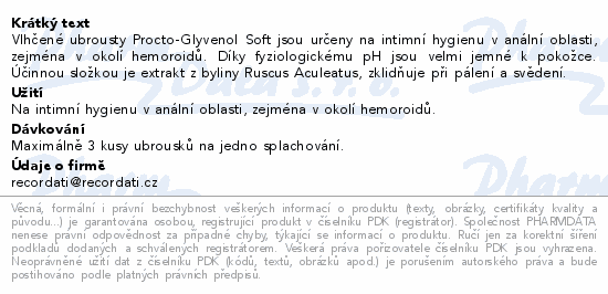 Procto-Glyvenol Soft vlhčené ubrousky jsou zdravotnický prostředek určený k jemné a šetrné hygieně v oblasti konečníku, zejména při potížích spojených s hemoroidy. Účinnou složkou je extrakt z byliny Ruscus aculeatus, který napomáhá pečovat o pokožku při pocitu svědění a pálení. Díky fyziologickému pH jsou velmi jemné k pokožce. Ubrousky jsou bez alkoholu a parfemace, což zajišťuje jejich dobrou snášenlivost i při častém používání. Používají se místo běžného toaletního papíru nebo následně po omytí, a to dle potřeby i několikrát denně.
