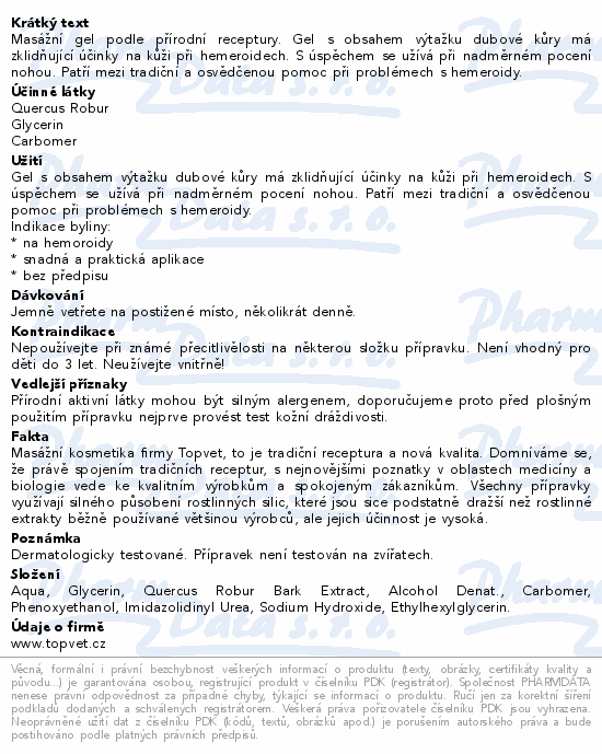 Masážní gel podle přírodní receptury. Gel s obsahem výtažku dubové kůry má zklidňující účinky na kůži při hemeroidech. S úspěchem se užívá při nadměrném pocení nohou. Patří mezi tradiční a osvědčenou pomoc při problémech s hemeroidy.
