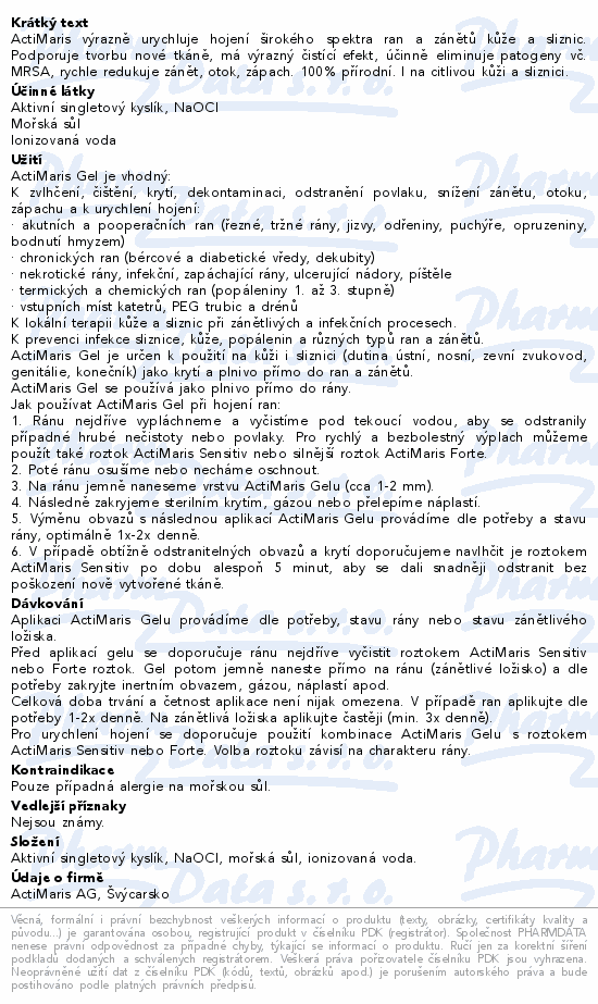 ActiMaris Gel je zdravotnický prostředek určený k čištění, zvlhčování a podpoře hojení akutních i chronických ran, včetně infikovaných. Je vhodný pro použití u dospělých i dětí.