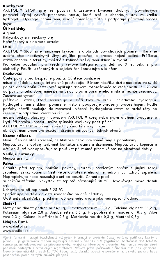 AKUTOL™ STOP sprej se používá k zastavení krvácení drobných povrchových poranění. Sprej vytvoří prachovou vrstvu, která sráží a absorbuje krev za vzniku hydrogelu. Hydrogel chrání ránu, zklidní poraněné místo a podporuje přirozený proces hojení.