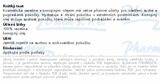 Kosmetická vazelína s konopným olejem má velice příznivé účinky pro ošetření suché a popraskané pokožky. Hydratuje a chrání pokožku v extrémních podmínkách. Konopný olej snižuje suchost pokožky, která může zapříčinit podráždění a svědění.