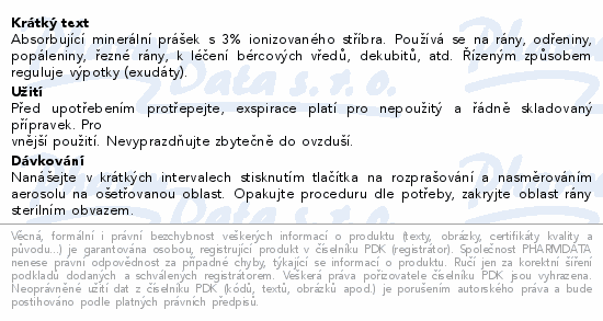 Absorbující minerální prášek s 3% ionizovaného stříbra. Používá se na rány, odřeniny, popáleniny, řezné rány, k léčení bércových vředů, dekubitů, atd. Řízeným způsobem reguluje výpotky (exudáty).