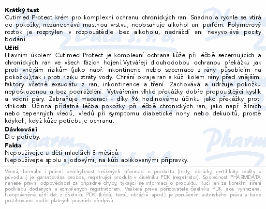 Cutimed Protect krém pro komplexní ochranu chronických ran. Snadno a rychle se vtírá do pokožky, nezanechává mastnou vrstvu, neobsahuje alkohol ani parfém. Polymerový roztok je rozptýlen v rozpouštědle bez alkoholu, nedráždí ani nevyvolává pocity bodání.