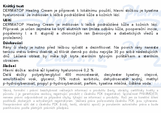 DERMATOP Healing Cream je přípravek k lokálnímu použití, hlavní složkou je kyselina hyaluronová. Je indikován k léčbě podrážděné kůže a kožních lézí.