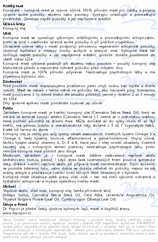 Konopela - konopná mast je vysoce účinná 100% přírodní mast pro osoby s projevy výrazně suché pokožky, ekzému nabo psoriázy. Vynikající zvláčňující a promašťující prostředek. Zmírňuje napětí pokožky a její nepříjemné svědění.