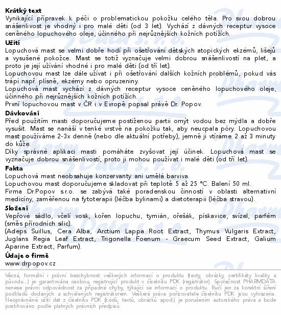 vynikající přípravek k péči o problematickou pokožku celého těla. Pro svou dobrou snášenlivost je vhodný i pro malé děti (od 3 let). Vychází z dávných receptur vysoce ceněného lopuchového oleje, účinného při nejrůznějších kožních potížích.