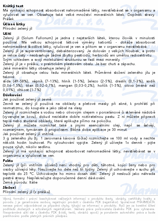 Má vynikající schopnost absorbovat nahromaděné látky, nevstřebávat se v organismu a vylučovat se ven. Obsahuje také velké množství minerálních látek. Doplněk stravy. Prášek.