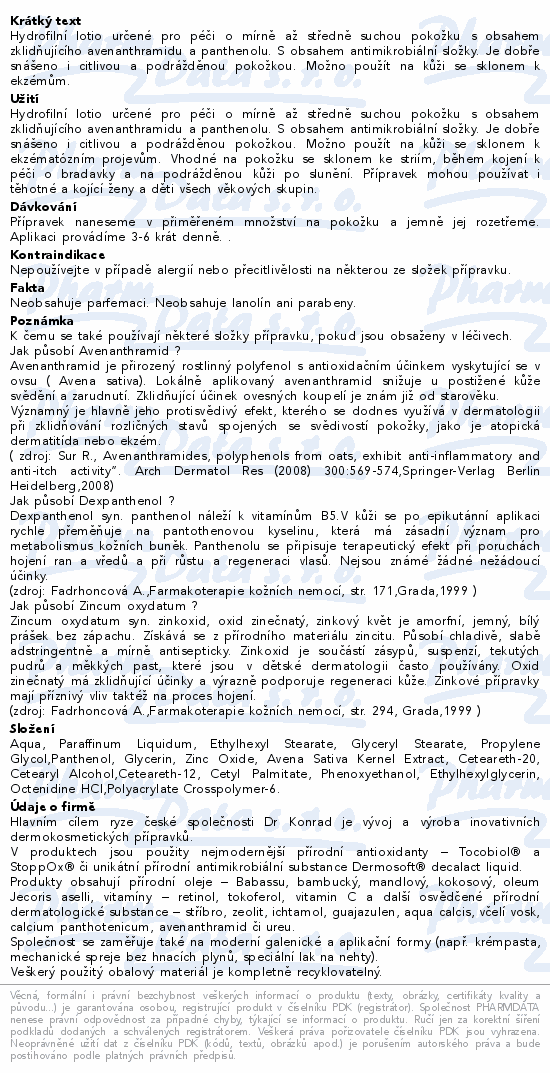 Neokluzivní hydrofilní lotio k péči o mírně až středně vysušenou, podrážděnou pokožku s obsahem zklidňujícího avenanthramidu a panthenolu s epitelizačním účinkem a s antimikrobiální složkou. Se zklidňujícím a protisvědivým účinkem.