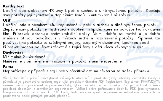 Lipofilní lotio s obsahem 4% urey k péči o suchou a silně vysušenou pokožku. Zlepšuje stav pokožky její hydratací a doplněním lipidů. S antimikrobiální složkou.