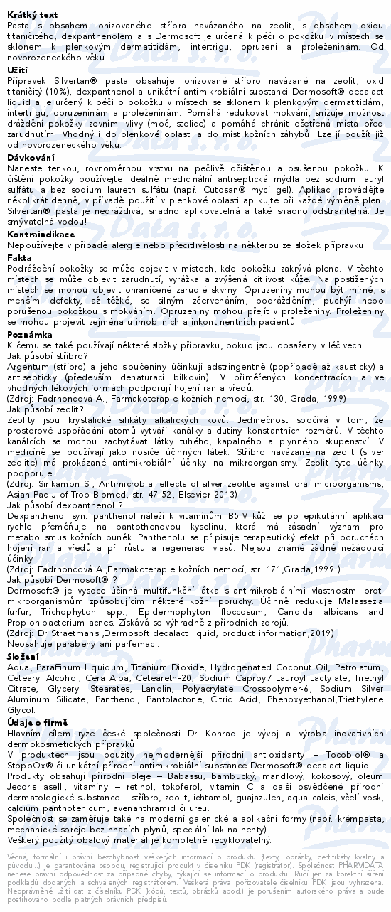 Pasta s obsahem ionizovaného stříbra navázaného na zeolit, s obsahem oxidu titaničitého, dexpanthenolem a s Dermosoft je určená k péči o pokožku v místech se sklonem k plenkovým dermatitidám, intertrigu, opruzení a proleženinám. Od novorozeneckého věku.