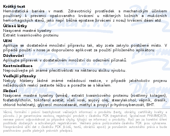 Hemostatická bariéra v masti. Zdravotnický prostředek s mechanickým účinkem používaný k prevenci opakovaného krvácení u některých kožních a mukózních hemorhagických stavů, jako např. běžná epistaxe (krvácení z nosu) krvácení dásní atd.