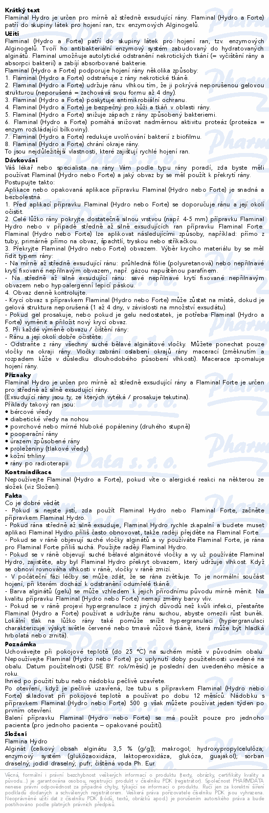 Flaminal Hydro je určen pro mírně až středně exsudující rány. Flaminal (Hydro a Forte) patří do skupiny látek pro hojení ran, tzv. enzymových Alginogelů.