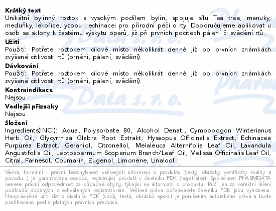 Unikátní bylinný roztok s vysokým podílem bylin, spojuje sílu Tea tree, manuky, meduňky, lékořice, yzopu i echinacei pro přírodní péči o rty. Doporučujeme aplikovat u osob se sklony k častému výskytu oparů, již při prvních pocitech pálení či svědění rtů.