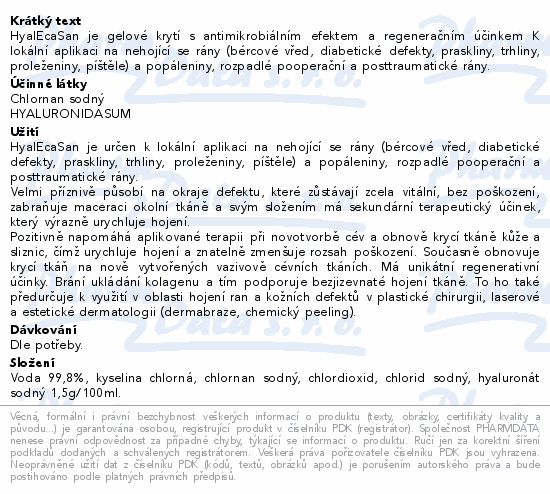 HyalEcaSan je gelové krytí s antimikrobiálním efektem a regeneračním účinkem K lokální aplikaci na nehojící se rány (bércové vřed, diabetické defekty, praskliny, trhliny, proleženiny, píštěle) a popáleniny, rozpadlé pooperační a posttraumatické rány.