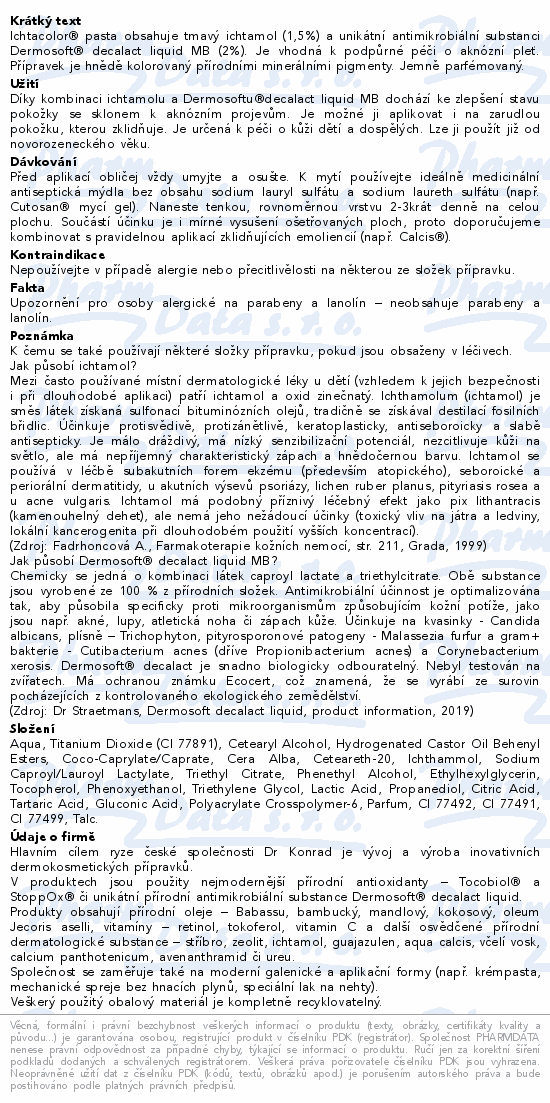 Pasta s obsahem ichtamolu a s antimikrobiální substancí je určená k péči o pokožku se sklonem k aknózním projevům. Přípravek je hnědě kolorovaný přírodními minerálními pigmenty.