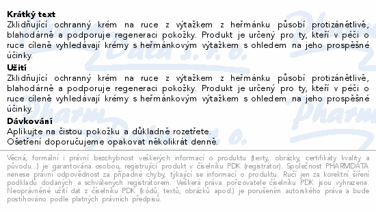 Zklidňující ochranný krém na ruce z výtažkem z heřmánku působí protizánětlivě, blahodárně a podporuje regeneraci pokožky. Produkt je určený pro ty, kteří v péči o ruce cíleně vyhledávají krémy s heřmánkovým výtažkem s ohledem na jeho prospěšné účinky.