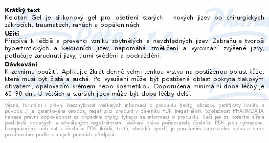 Kelotan Gel je silikonový gel pro ošetření starých i nových jizev po chirurgických zákrocích, traumatech, ranách a popáleninách.