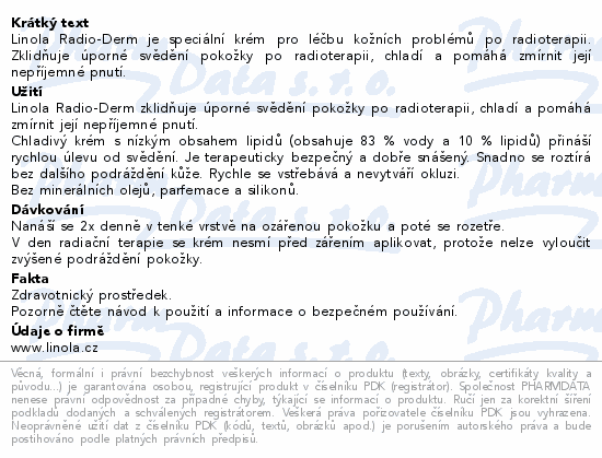 Linola Radio-Derm je speciální krém pro léčbu kožních problémů po radioterapii. Zklidňuje úporné svědění pokožky po radioterapii, chladí a pomáhá zmírnit její nepříjemné pnutí.