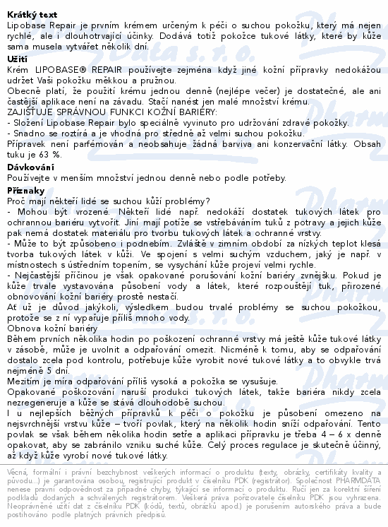 Lipobase Repair je prvním krémem určeným k péči o suchou pokožku, který má nejen rychlé, ale i dlouhotrvající účinky. Dodává totiž pokožce tukové látky, které by kůže sama musela vytvářet několik dní.