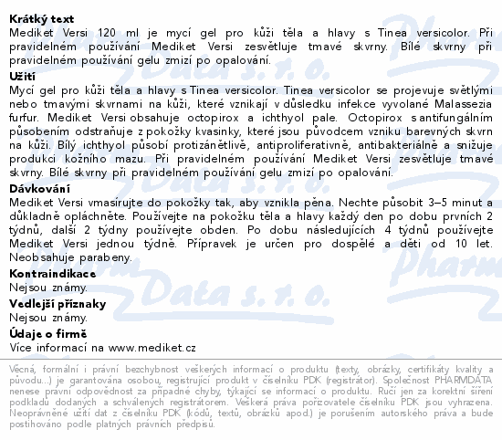 Mediket Versi 120 ml je mycí gel pro kůži těla a hlavy s Tinea versicolor. Při pravidelném používání Mediket Versi zesvětluje tmavé skvrny. Bílé skvrny při pravidelném používání gelu zmizí po opalování.