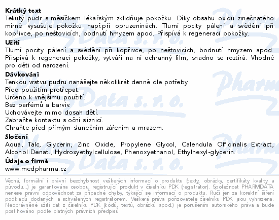 Tekutý pudr s měsíčkem lékařským zklidňuje pokožku. Díky obsahu oxidu zinečnatého mírně vysušuje pokožku např.při opruzeninách. Tlumí pocity pálení a svědění při kopřivce, po neštovicích, bodnutí hmyzem apod. Přispívá k regeneraci pokožky.