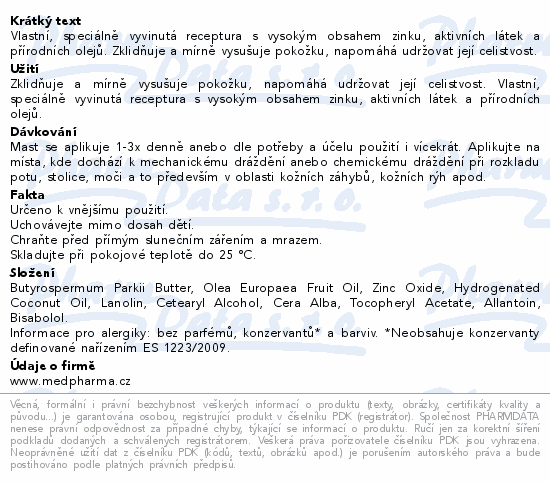 Vlastní, speciálně vyvinutá receptura s vysokým obsahem zinku, aktivních látek a přírodních olejů. Zklidňuje a mírně vysušuje pokožku, napomáhá udržovat její celistvost.