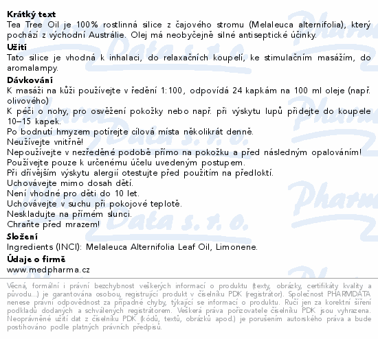 Tea Tree Oil je 100% rostlinná silice z čajového stromu (Melaleuca alternifolia), který pochází z východní Austrálie. Olej má neobyčejně silné antiseptické účinky.