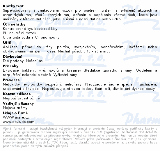 Superoxidovaný antimikrobiální roztok pro ošetření (čištění a zvlhčení) akutních a chronických ran, vředů, řezných ran, odřenin a popálenin včetně těch, které jsou umístěny v tělních dutinách, jako je ústní a nosní dutina nebo ucho.