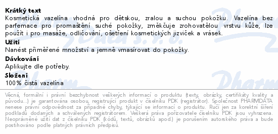 Kosmetická vazelína vhodná pro dětskou, zralou a suchou pokožku. Vazelína bez parfemace pro promaštění suché pokožky, změkčuje zrohovatělou vrstvu kůže, lze použít i pro masáže, odličování, ošetření kosmetických jizviček a vrásek.
