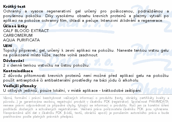 Ochranný a vysoce regenerativní gel určený pro poškozenou, podrážděnou a porušenou pokožku. Díky vysokému obsahu krevních proteinů a plazmy vytváří po aplikaci na pokožce ochranný film, chladí a pečuje. Intenzivní zklidnění a regenerace.