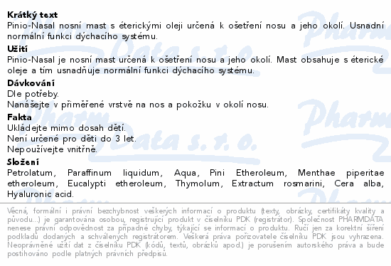 Pinio-Nasal nosní mast s éterickými oleji určená k ošetření nosu a jeho okolí. Usnadní normální funkci dýchacího systému.