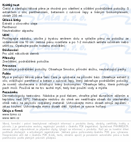 Čistící a ošetřující tělová pěna je vhodná pro ošetření a očištění podrážděné pokožky. S extraktem z oliv, panthenolem, betainem z cukrové řepy a lněným biokomplexem, obsah 250 ml.