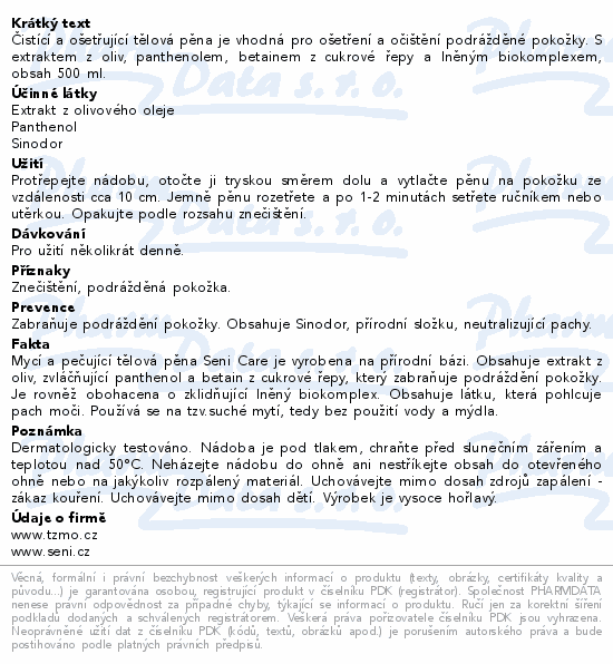 Čistící a ošetřující tělová pěna je vhodná pro ošetření a očištění podrážděné pokožky. S extraktem z oliv, panthenolem, betainem z cukrové řepy a lněným biokomplexem, obsah 500 ml.