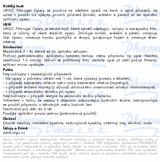 URGO Filmogel Opary je zdravotnický prostředek určený k ochraně a podpoře hojení oparů na rtech a v jejich okolí. Po nanesení vytváří průhledný, pružný ochranný film, který funguje jako bariéra proti vnějším vlivům a zároveň pomáhá zmírnit bolest, svědění a pálení spojené s výsevem oparu.