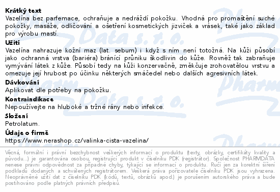 Vazelína bez parfemace, ochraňuje a nedráždí pokožku. Vhodná pro promaštění suché pokožky, masáže, odličování a ošetření kosmetických jizviček a vrásek, také jako základ pro výrobu mastí.