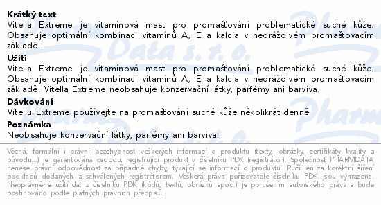 Vitella Extreme je vitamínová mast pro promašťování problematické suché kůže. Obsahuje optimální kombinaci vitamínů A, E a kalcia v nedráždivém promašťovacím základě.
