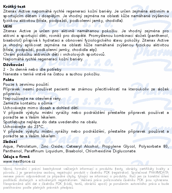 Zitenax Active napomáhá rychlé regeneraci kožní bariéry. Je určen zejména aktivním a sportujícím dětem i dospělým. Je vhodný zejména na oblasti kůže namáhané zvýšenou fyzickou aktivitou (třísla, podpaždí, podkolenní jamky, chodidla).
