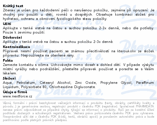 Zitenax je určen pro každodenní péči o narušenou pokožku, zejména při opruzení. Je vhodný pro použití u dětí, rovněž u dospělých. Obsahuje kombinaci složek pro hydrataci, ochranu a obnovení fyziologického stavu pokožky.