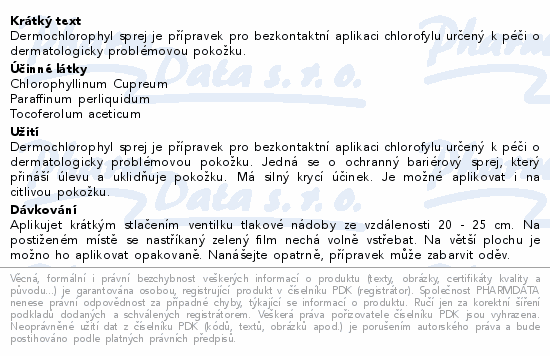 Dermochlorophyl sprej je přípravek pro bezkontaktní aplikaci chlorofylu určený k péči o dermatologicky problémovou pokožku.