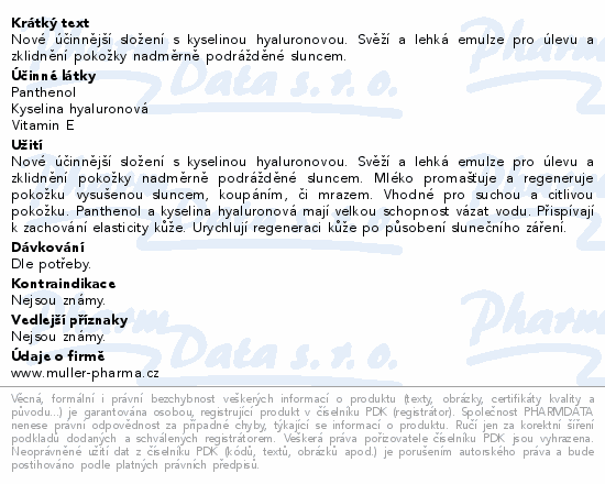 Nové účinnější složení s kyselinou hyaluronovou. Svěží a lehká emulze pro úlevu a zklidnění pokožky nadměrně podrážděné sluncem.
