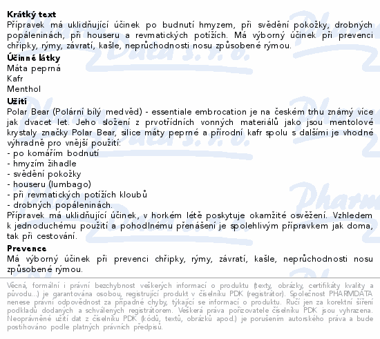 Přípravek má uklidňující účinek po budnutí hmyzem, při svědění pokožky, drobných popáleninách, při houseru a revmatických potížích. Má výborný účinek při prevenci chřipky, rýmy, závratí, kašle, neprůchodnosti nosu způsobené rýmou.