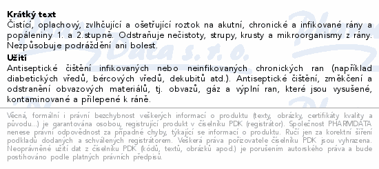Čistící, oplachový, zvlhčující a ošetřující roztok na akutní, chronické a infikované rány a popáleniny 1. a 2.stupně. Odstraňuje nečistoty, strupy, krusty a mikroorganismy z rány. Nezpůsobuje podráždění ani bolest.