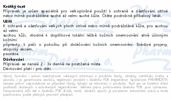 Přípravek je určen speciálně pro velkoplošné použití k ochraně a ošetřování citlivé nebo mírně podrážděné suché až velmi suché kůže. Čtěte pozorně příbalový leták.