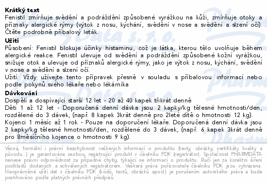 Fenistil zmírňuje svědění a podráždění způsobené vyrážkou na kůži, zmírňuje otoky a příznaky alergické rýmy (výtok z nosu, kýchání, svědění v nose a svědění a slzení očí). Čtěte pozorně příbalový leták.