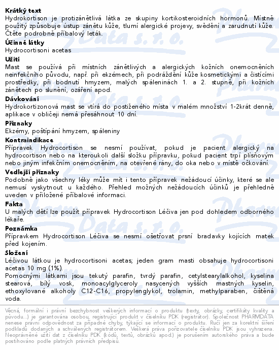 Hydrocortison Léčiva mast je léčivý přípravek určený k zevnímu použití při zánětlivých a svědivých kožních onemocněních neinfekčního původu. Obsahuje kortikosteroidní léčivou látku hydrokortison v koncentraci 1 %, který působí protizánětlivě, protisvědivě a proti alergickým reakcím.