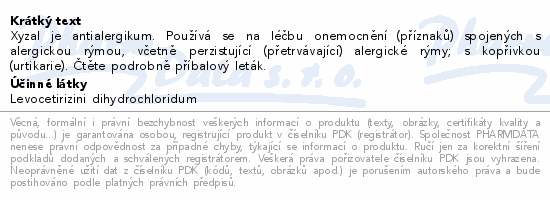 Xyzal 5 mg je léčivý přípravek určený k léčbě alergických onemocnění, který obsahuje levocetirizin dihydrochlorid – účinné antihistaminikum 2. generace (blokuje histaminové H1 receptory, nesedativní, rychlý a dlouhý účinek). Přípravek je určen k úlevě od příznaků sezóní a celoroční alergické rýmy (kýchání, rýma, svědění nosu, slzení očí) a chronické kopřivky (svědění, zarudnutí, vyrážka).