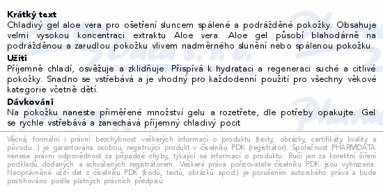 Chladivý gel aloe vera pro ošetření sluncem spálené a podrážděné pokožky. Obsahuje velmi vysokou koncentraci extraktu Aloe vera. Aloe gel působí blahodárně na podrážděnou a zarudlou pokožku vlivem nadměrného slunění nebo spálenou pokožku.