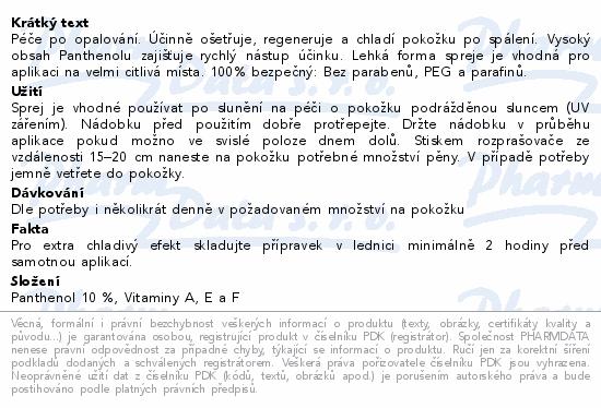 Péče po opalování. Účinně ošetřuje, regeneruje a chladí pokožku po spálení. Vysoký obsah Panthenolu zajišťuje rychlý nástup účinku. Lehká forma spreje je vhodná pro aplikaci na velmi citlivá místa. 100% bezpečný: Bez parabenů, PEG a parafinů.