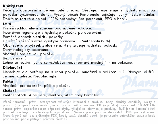 Péče po opalování a během celého roku. Ošetřuje, regeneruje a hydratuje suchou pokožku vystavenou slunci. Vysoký obsah Panthenolu zajišťuje rychlý nástup účinku. Dobře se roztírá a nelepí. 100% bezpečný: Bez parabenů, PEG a barviv.