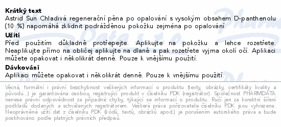 Astrid Sun Chladivá regenerační pěna po opalování s vysokým obsahem D-panthenolu (10 %) napomáhá zklidnit podrážděnou pokožku zejména po opalování.